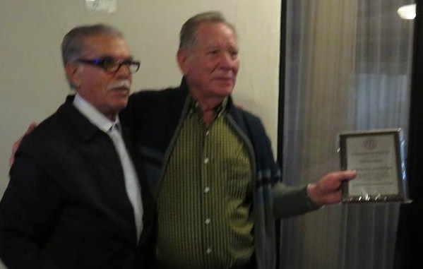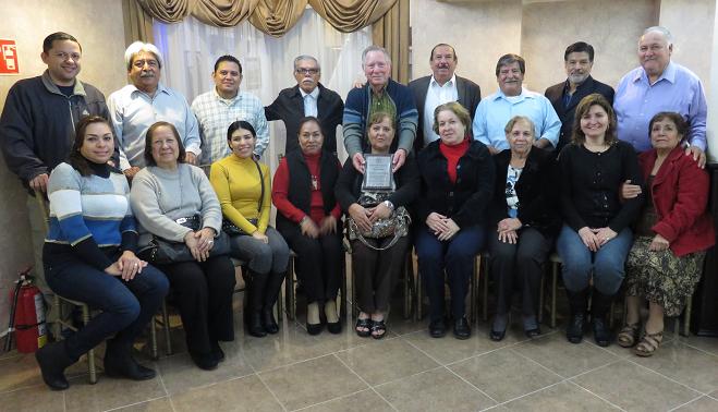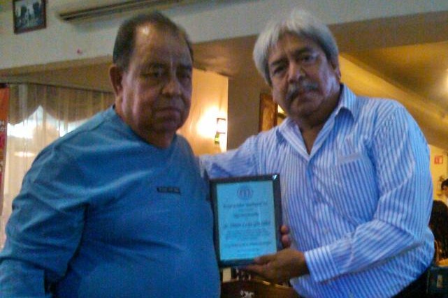 De derecha a izquierda: El Tesorero del C.F. Real Paraiso A.C. Reynaldo Torres Garcia haciendo entrega del Reconocimiento a nuestro compañero y amigo Simón Leija González miembro Fundador del Club en 1958.