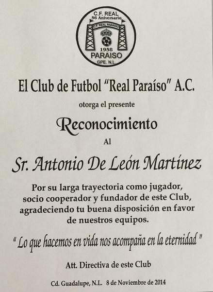 De izquierda a derecha: El Director General de Equipos del C.F. Real Paraiso A.C. Raúl Ayala Rodriguez haciendo entrega del Reconocimiento a nuestro compañero y amigo Romeo de la Garza Rodríguez miembro Fundador del Club en 1958.