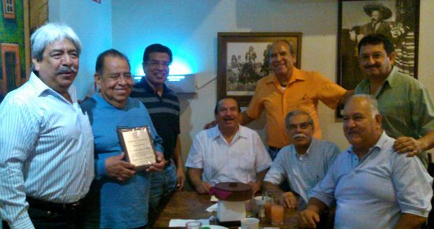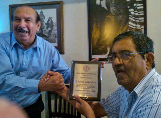 De izquierda a derecha: El Presidente del C.F. Real Paraiso A.C. Vicente Ayala Rodriguez haciendo entrega del Reconocimiento a nuestro compañero y amigo Rolando Lozano Garza miembro Fundador del Club en 1958.