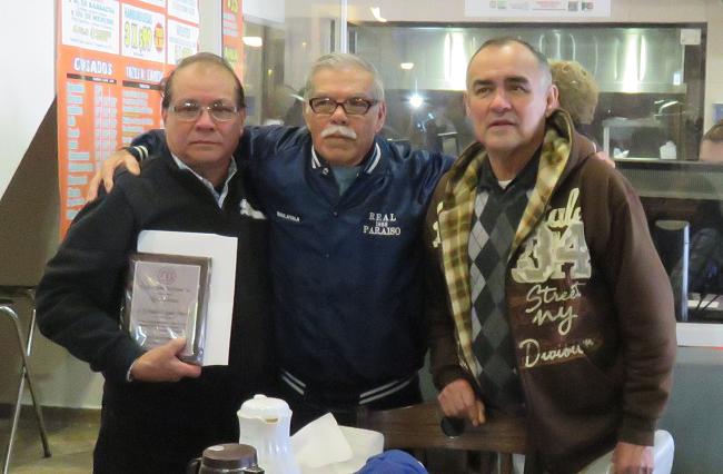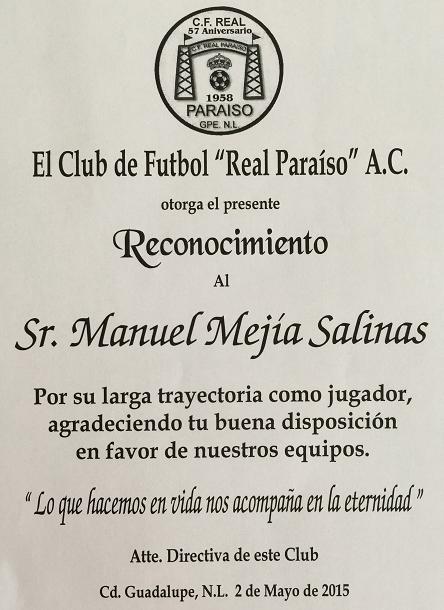 De izquierda a derecha: El Coordinador de Eventos del C.F. Real Paraiso A.C. José Luis Cepeda Reyna haciendo entrega del Reconocimiento a Fernando Delgado Jiménez "La Pingua" Excelente Mediocampista durante la Epoca Dorada, Ricardo Reyes Gloria "Chichí' Gran Defensa y Goleador durante la Epoca Dorada recibiendo su Reconocimiento de manos del también Coordinador de Eventos del C.F. Real Paraiso A.C. Fernando Ramos Guajardo.