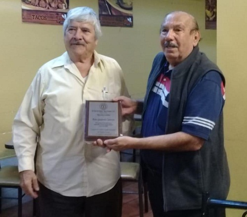 Raúl Ayala Rodríguez Directivo del C.F. Real Paraiso A.C. hace entrega del reconocimiento a Juan García de la Cruz por su trayectoria como excelente Centro Delantero en la Epoca Dorada del Club.