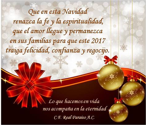 El C.F. Real Paraiso A.C. desea a todos sus Miembros y Amigos de México y del Extranjero, los mejores deseos para esta Navidad y Año Nuevo, además de hacerles saber que están presentes cada momento, se les Aprecia y Recuerda con Inmenso Cariño.